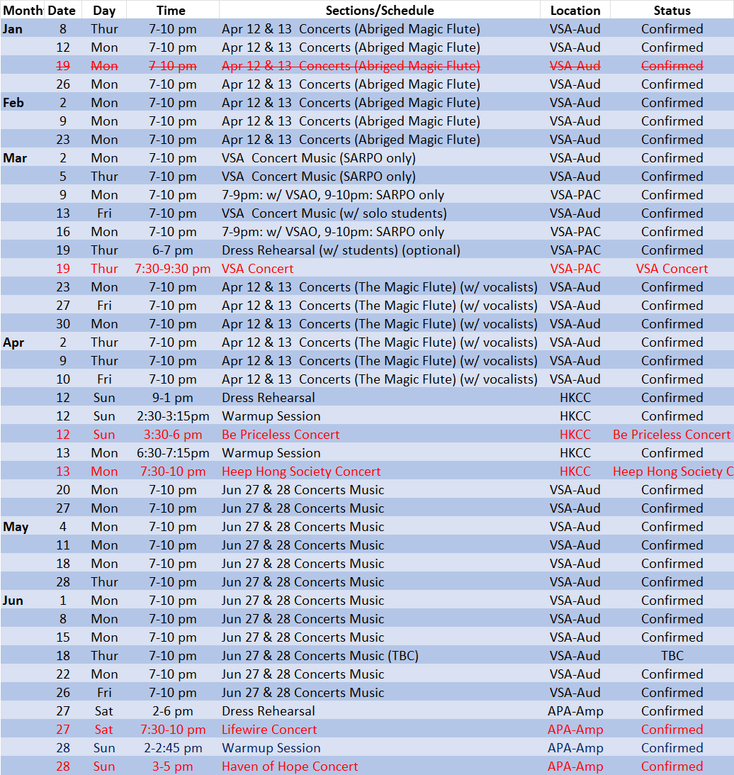 The tentative rehearsal schedule for our upcoming 2026 concerts is set out below. Further dates for rehearsals from July 2026 onwards will be advised as soon as possible